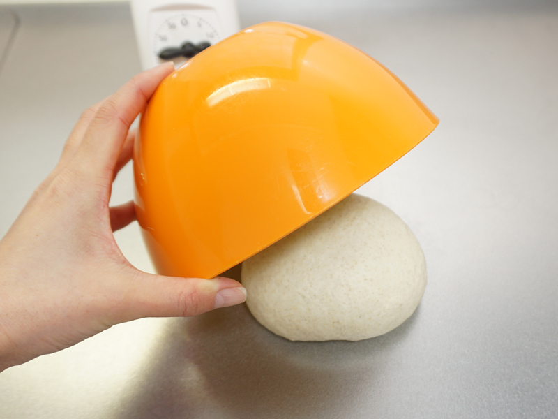 二次発酵:ラップをして、暖かい場所で2倍の大きさになるまで発酵します。夏場は常温で、冬場はオーブンの発酵機能(35℃)で約50分程度が目安です。